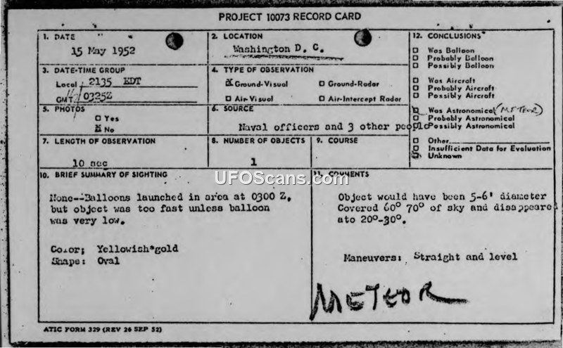 The object was observed by multiple witnesses, including US Navy personnel, in the Georgetown area of Washington D.C. While initially reported as a saucer-like object, the final assessment on the record card identifies it as a meteor.