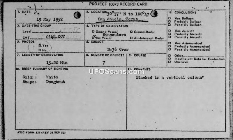 Project 10073 Record Card — 19 May 1952, San Angelo, Texas