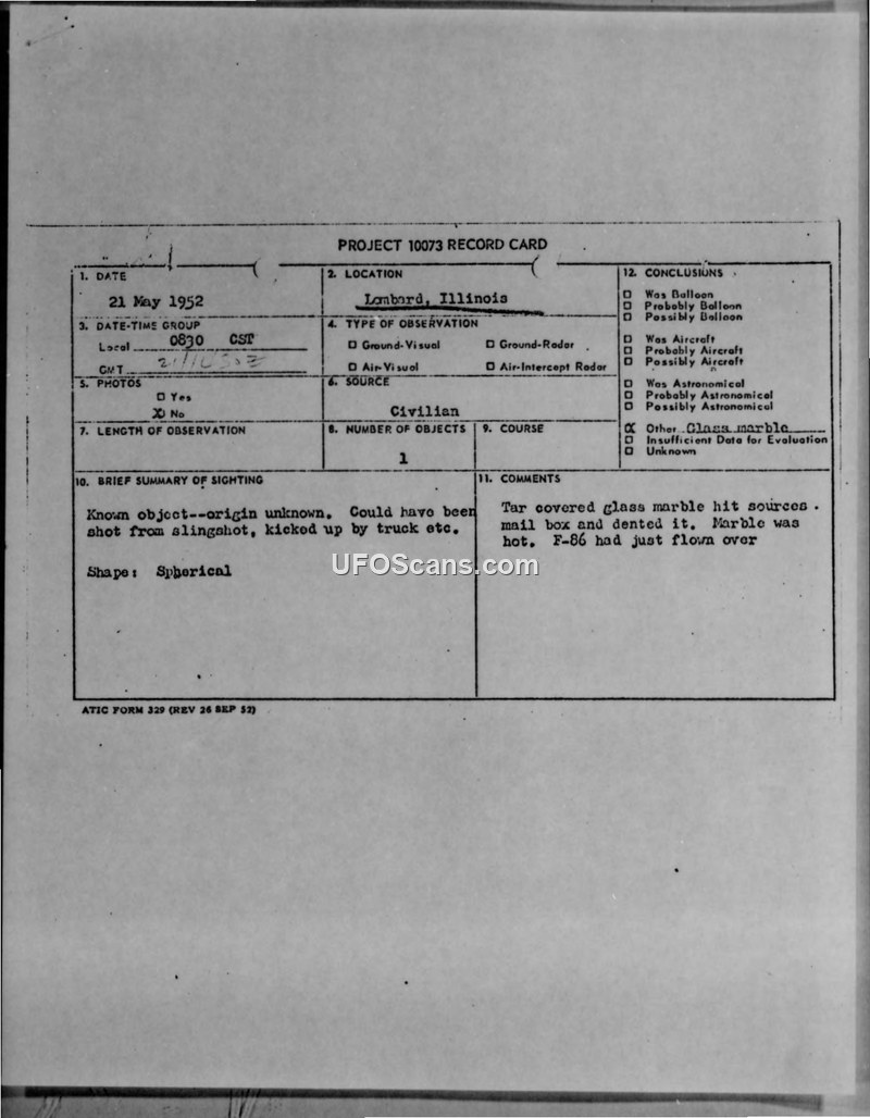 A glass marble covered in tar struck a mailbox in Lombard, Illinois, in 1952. The Air Technical Intelligence Center concluded it was likely thrown or slung and required no further investigation.