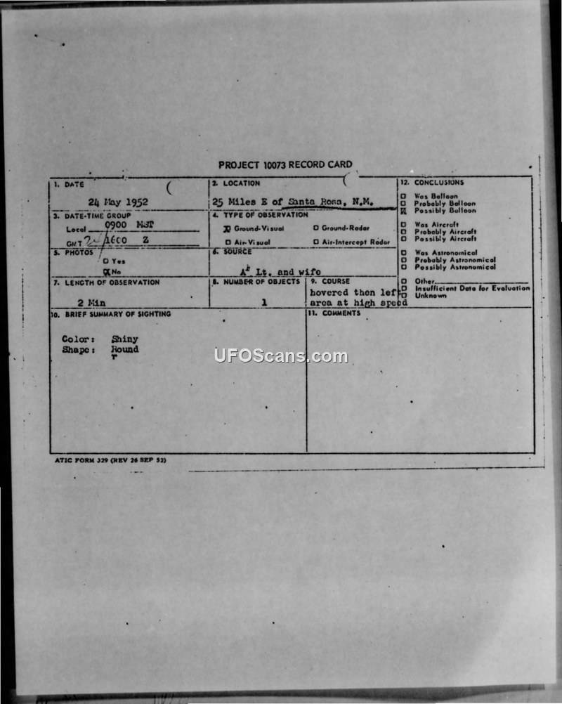 A USAF officer and his wife reported a stationary, shiny, round object in the sky near Santa Rosa, New Mexico, on 24 May 1952. The object hovered for two minutes before departing at high speed, with later annotations suggesting it may have been a balloon.