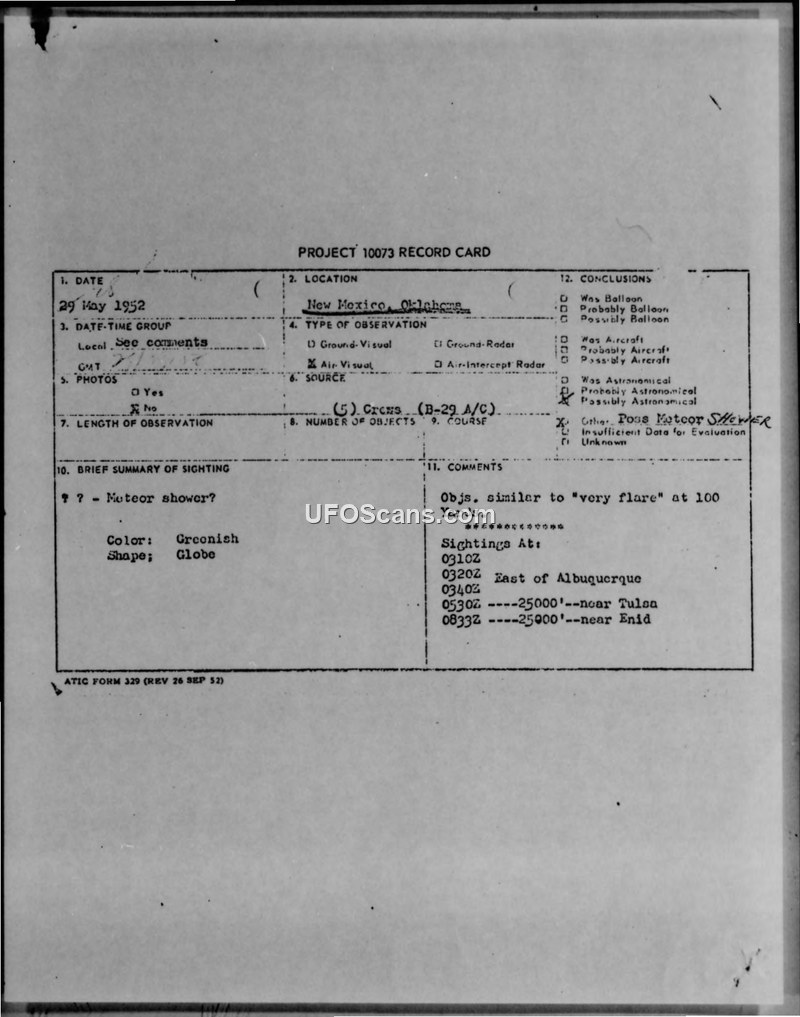 B-29 crews reported five greenish, globe-shaped objects over New Mexico and Oklahoma on 29 May 1952. While officially categorized as a possible meteor shower, the reporting crews explicitly stated their belief that the objects were not meteorites.