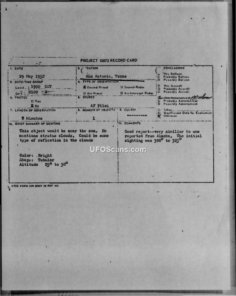 An Air Force pilot observed a bright, tubular object over San Antonio for 14 minutes on 29 May 1952. The object performed maneuvers and changed color before accelerating out of sight, resulting in an 'insufficient data' classification.
