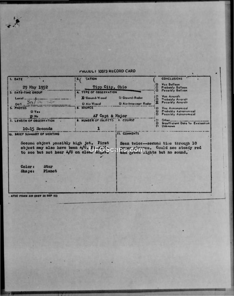 Project 10073 Record Card — Tipp City, Ohio, 29 May 1952