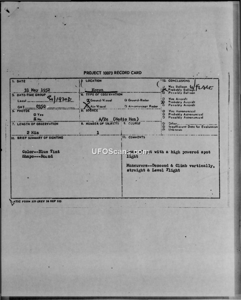 Air Intelligence Information Report: Sighting of Unidentified Flying Object, North Korea, 31 May 1952