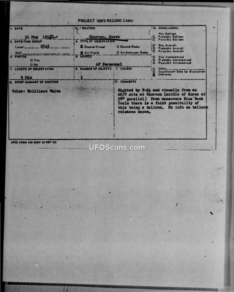 Air Intelligence Information Report: Sighting of Unidentified Flying Object, 31 May 1952, South Korea
