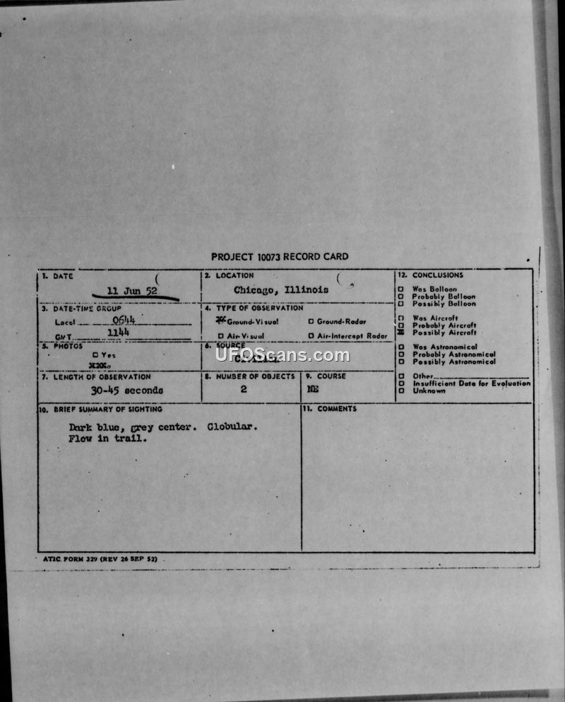 This collection of documents details multiple reports of Unidentified Aerial Phenomena (UAP) in the Chicago, Illinois area during June 1952. The primary report concerns a sighting on 11 June 1952, where a civilian observer reported two globular, dark blue objects with grey centers, approximately six inches in diameter, moving in a trail formation from the southwest to the northeast at an estimated altitude of 6,000 feet and a speed of 500 MPH. The observation lasted between 30 and 45 seconds. The observer, who was noted as having experience in judging aircraft altitude and speed, initially delayed reporting the incident until a newspaper article regarding 'flying saucers' prompted him to contact the authorities. Air Force intelligence officers, including Captain Neil M. MacLachlan, evaluated the report and concluded that there was no known condition or activity that could account for the sighting. The documents also include a separate report from 23 June 1952, involving a Major John H. Eleveld Jr. of the Civil Air Patrol, who observed two round objects resembling 'giant soap bubbles' near Owensboro, Kentucky, which reflected the sun in a yellow-lavender light. These objects were also described as flying in a trail formation and moving at high altitude. The documentation includes standard Project 10073 record cards, intelligence information reports (AF Form 112), and correspondence between various military units, including the 5th District OSI and the Air Technical Intelligence Center (ATIC). The reports emphasize that the objects did not follow the flight characteristics of conventional aircraft, and in the Chicago case, the observer noted the objects did not follow the curve of the earth, leading to speculation about their origin. The files are marked as unclassified and were downgraded at three-year intervals per DOD Directive 5200.10.
