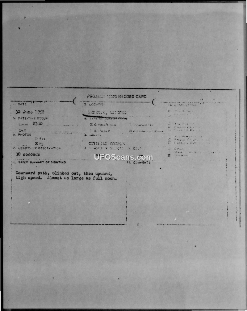 UNKNOWN SUBJECT(S) Unidentified Object over 35th Avenue Phoenix Arizona 30 June 1952