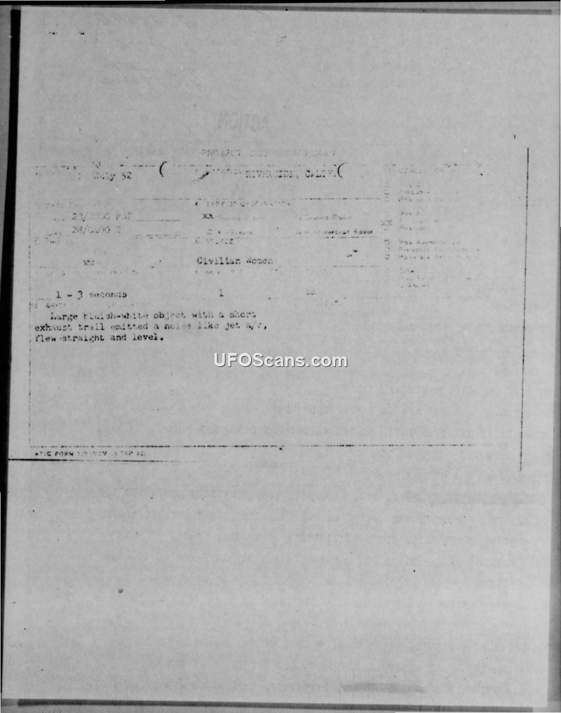 A military teletype report from 1952 detailing a brief sighting of a large, round, bluish-white object over Riverside, California. The object, which emitted a jet-like noise and had a comet-like exhaust trail, was observed by two individuals but left no physical evidence.