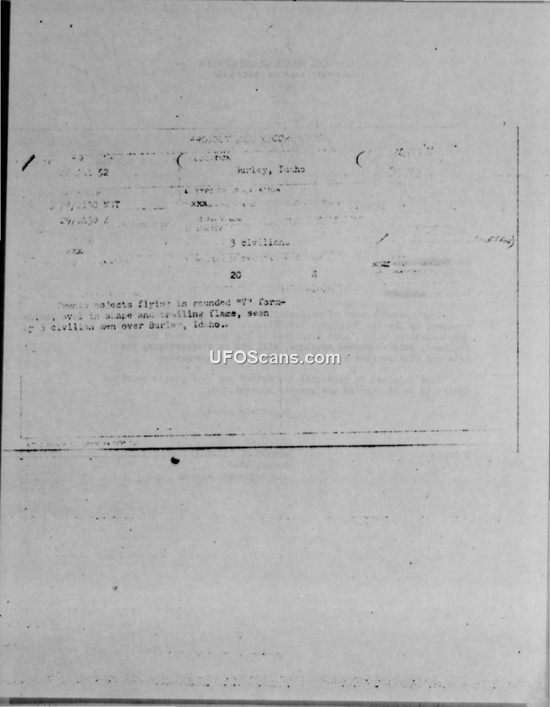 On July 28, 1952, twenty oval-shaped objects in a V-formation were sighted over Burley, Idaho. The Air Technical Intelligence Center investigated the report (IR-469-52) but found insufficient data to reach a conclusion.