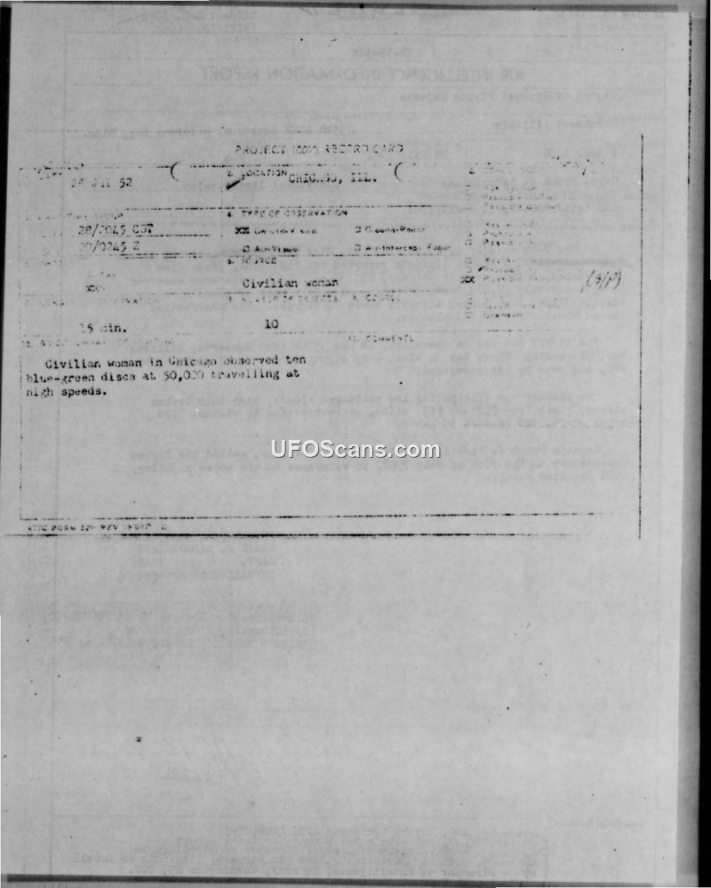 A civilian woman in Chicago reported seeing ten blue-green disc-shaped objects on July 28, 1952. Military radar and ground observers reported no corresponding activity, and an inquiry to Yerkes Observatory provided no explanation.