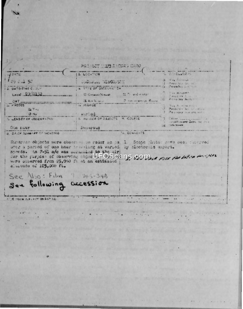 This report details a series of unidentified aerial phenomena observed on 29 July 1952 near Osceola, Wisconsin, by personnel of the 674th Aircraft Control and Warning Squadron. Between 0130 and 0230 hours, numerous unidentified objects were detected by ground electronic means (AN/CPS-6B radar). The radar targets were described as having varied speeds, with one large, well-defined target moving at 600 knots, while others appeared in loose clusters moving at 50 to 60 knots. These targets typically appeared on the radar scope southwest of the station and proceeded in an easterly direction before disappearing. The report notes that these radar patterns were characterized by continual overlapping and that targets would appear and disappear suddenly. In conjunction with the radar sightings, an F-51 aircraft from the 109th Fighter-Interceptor Squadron was scrambled to intercept the targets. The pilot reported visually observing unidentified flying objects, estimating their altitude at 125,000 feet. Additionally, ground observers reported seeing short, yellowish flashes of light in the sky, which appeared to move in an arc and recurred at intervals. The Air Technical Intelligence Center (ATIC) later evaluated the data, suggesting that the radar sightings were likely the result of anomalous propagation affecting radar performance, which could cause ground clutter to appear as moving targets. However, the report explicitly states that this condition would not explain the movement of targets unless specific weather conditions were present. Despite the investigation, the official conclusion remained 'Unknown,' as a firm analysis could not be reached. The documentation includes radar scope photographs and signed narrative statements from the observers, as well as a 16mm film record of the event.