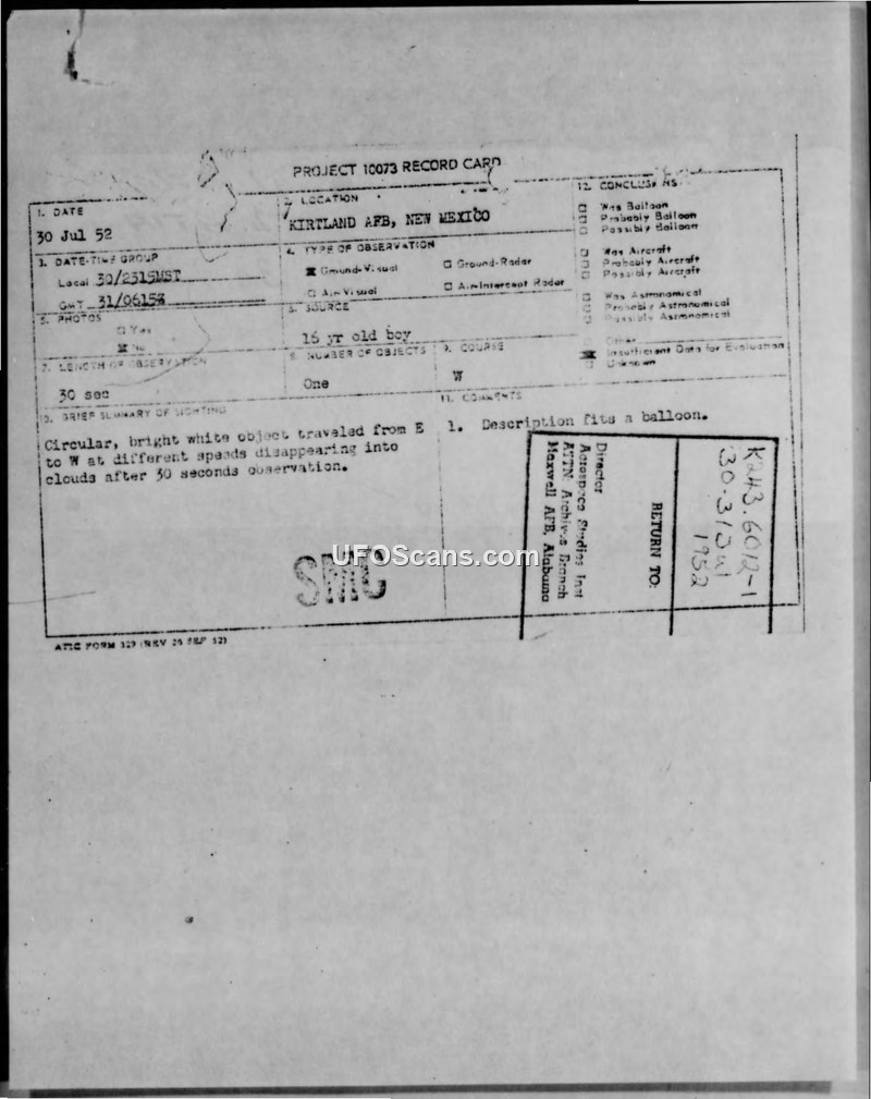 This collection of documents comprises a series of Air Intelligence Information Reports (AF Form 112) and associated correspondence from July and August 1952, documenting numerous sightings of Unidentified Aerial Phenomena (UAP) across the United States, including Alabama, New Mexico, Mississippi, Florida, California, and Maine. The reports, filed under Project 10073, detail observations made by military personnel, including control tower operators and radar technicians, as well as civilian witnesses. The objects were frequently described as circular, white, or amber-colored, and were often reported to hover or move at varying speeds. Several reports explicitly mention the use of radar (specifically the AN/CPS-5 set) to track these objects. In many instances, the Air Force investigators concluded that the sightings were attributable to conventional phenomena, such as weather balloons, temperature inversions, or misidentified aircraft. For example, a sighting in Mississippi was investigated as a potential freight train on the Illinois Central Railroad, while sightings in Maine were identified as weather balloons. The reports emphasize the reliability of the observers, who included experienced pilots and radar operators, yet consistently conclude that no physical evidence was obtained and that the objects did not exhibit maneuvers indicative of advanced technology. The documents reflect the systematic, albeit skeptical, approach of the Air Force in the early 1950s to catalog and evaluate UAP reports, often seeking to correlate visual sightings with meteorological data or known flight patterns.