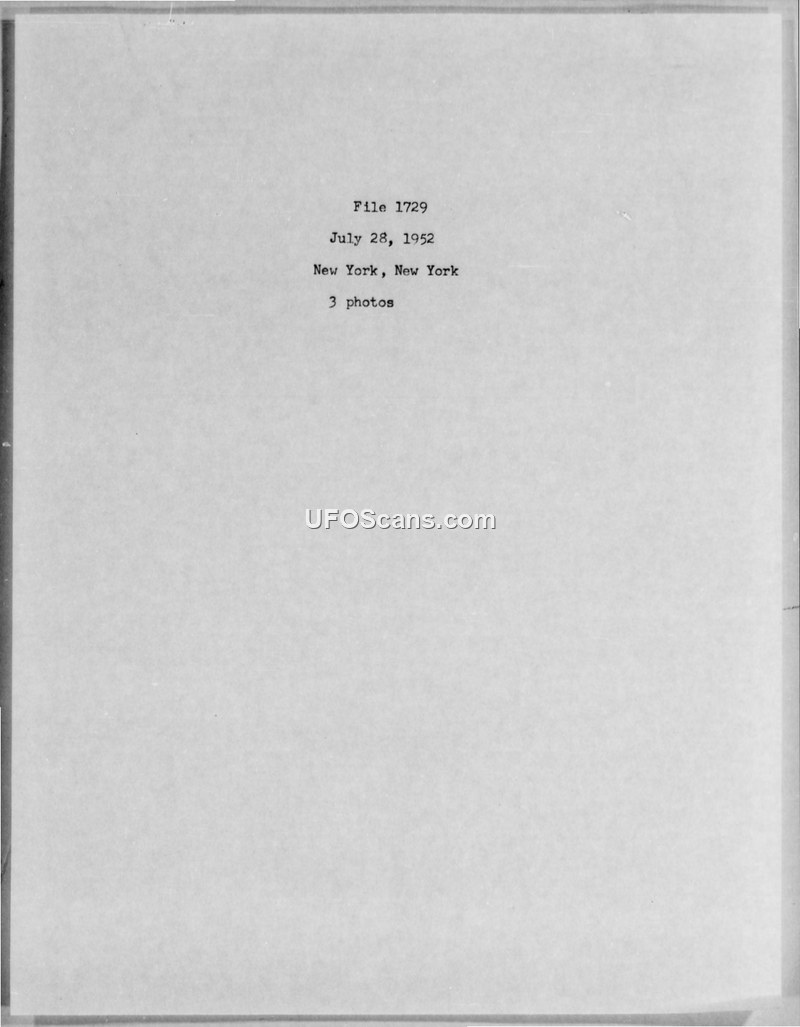 This document, identified as File 1729, serves as a record for a sighting incident that occurred in New York, New York, on July 28, 1952. The file consists of a cover sheet and three photographic images. The cover sheet provides the basic administrative details, noting the date, location, and the inclusion of three photographs. The subsequent pages contain the photographic evidence, which depicts a night scene featuring a bright, diffuse light source and a distinct, crescent-shaped object in the upper portion of the frame. The document provides no narrative description, witness testimony, or official analysis regarding the nature of the objects captured in the photographs. It functions strictly as a repository for the visual evidence associated with the file number.