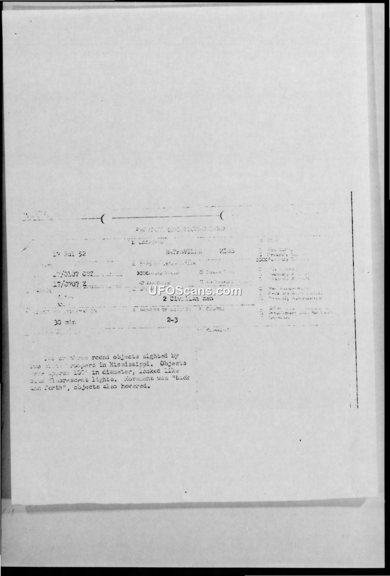 Unidentified Flying Objects Sighted Near Batesville, Mississippi 17 July 1952