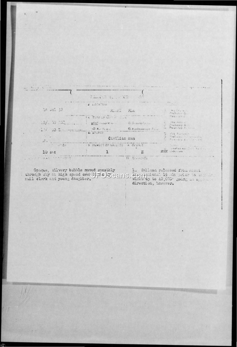 The object could very well have been a weather balloon released at Miami International Airport about 1045 hours, except for two reasons: 1. The winds were in the opposite direction. 2. It would have been impossible for a weather balloon to travel such a tremendous distance in a few seconds.