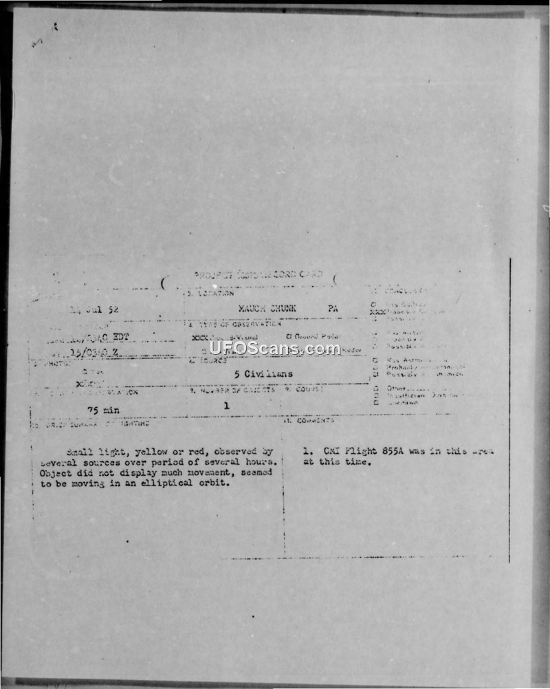 Project Blue Book Sighting Report — Mauch Chunk, Pennsylvania, July 15, 1952