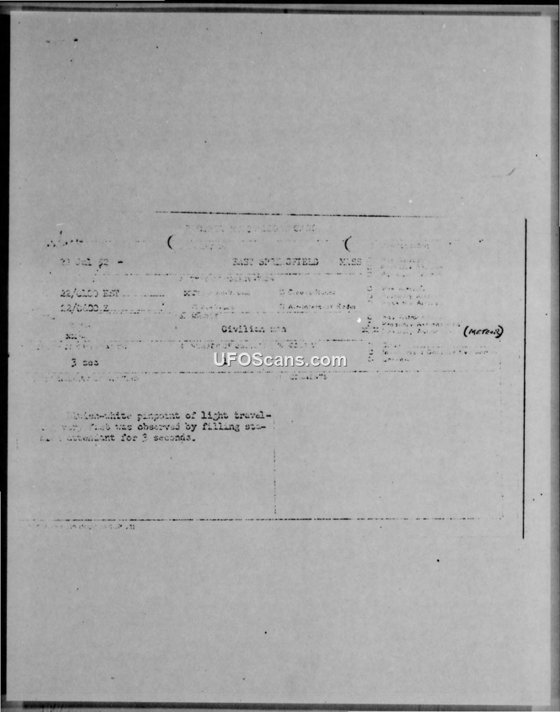 A gas station attendant in East Springfield, Massachusetts, reported a three-second sighting of a bluish-white light on July 22, 1952. The military report, which classifies the object as a meteor, notes the witness was considered reliable by a local pilot.