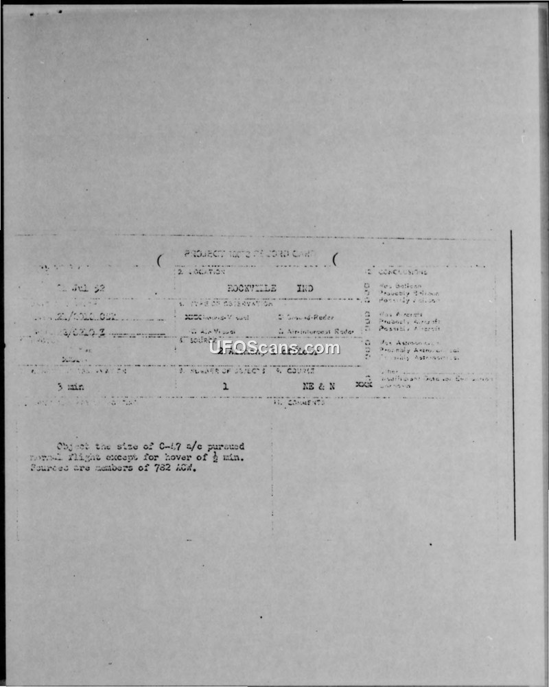 The object was observed by three members of the 782 ACW. It appeared to be a triangular, aluminum-colored object the size of a C-47, which hovered for approximately half a minute before moving north and disappearing in haze.