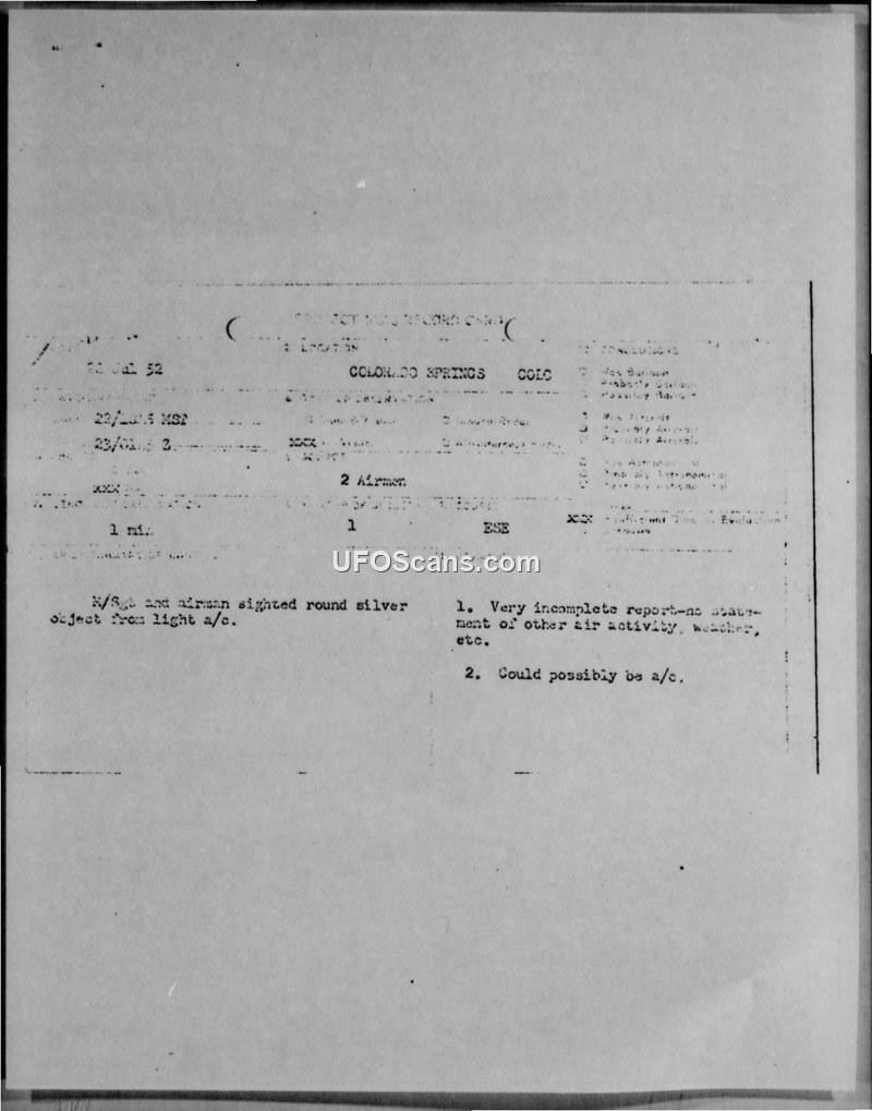A 1952 military intelligence report detailing a one-minute sighting of a round, silver, featureless object by two airmen in a Cessna 140 near Colorado Springs. The investigation concluded the report was incomplete and the object could potentially be an aircraft.