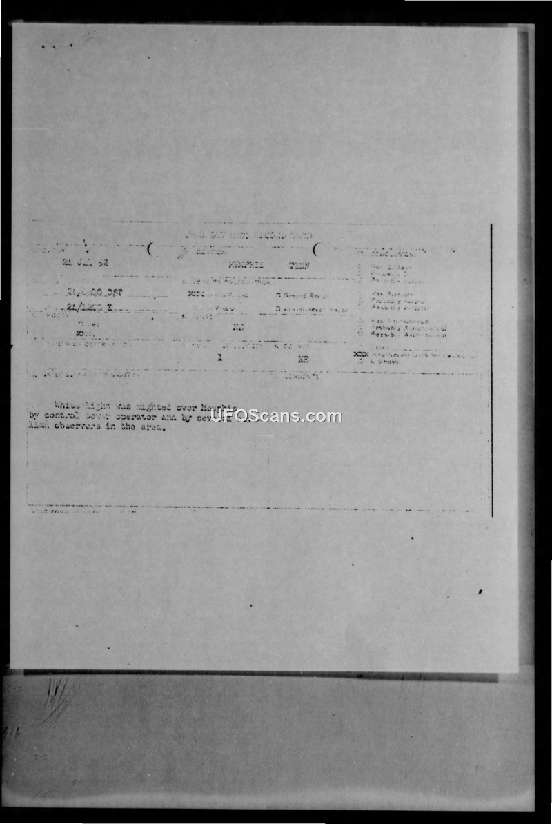 An unidentified white light was observed moving at high speed over Memphis, Tennessee, on July 24, 1952, by an airport traffic controller. The investigation concluded that the object could not be explained by wind-borne balloons or known air traffic.