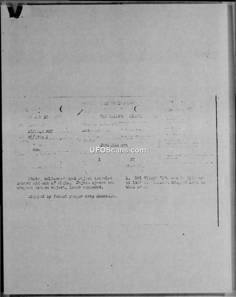This document is a teletype report concerning an aerial sighting that occurred on July 25, 1952, near The Dalles, Oregon. The primary witness, identified as an Assistant Chief Observer with the Ground Observer Corps, observed a transparent white, balloon-shaped object from a position atop Klickitat Mountain. The witness, utilizing high-powered glasses, reported that the object remained stationary for approximately four minutes before moving upward. During the observation, the object appeared to 'open up,' releasing a secondary object that circled the primary craft before disappearing. The primary object subsequently disintegrated, leaving small streaks of vapor trails, and four parachutes were observed falling on the south side of Mount Adams. The report notes that the observer possessed an instrument to measure altitude but could not definitively determine if the object was at 15,000 feet, 71,000 feet, or 7,100 feet. The document also references a GMI Flight 797 that was in the area at 1847Z, noting that a balloon had been dropped in the vicinity. The report concludes with a statement that there was no aircraft activity and no further information was available at the headquarters level.