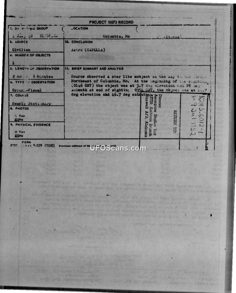 A civilian pilot and weather observer reported a star-like object in Columbia, Missouri, on 1 July 1952. The Air Force investigation concluded the object was the star Capella.
