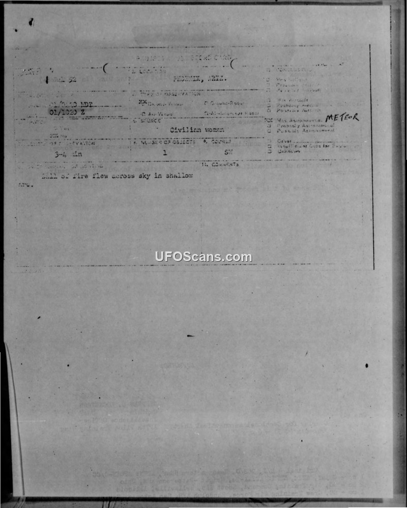 A civilian witness in Phoenix reported a 'ball of fire' object on 2 July 1952. The Air Force investigation found no military or commercial traffic in the area and concluded the significance of the event was undetermined.