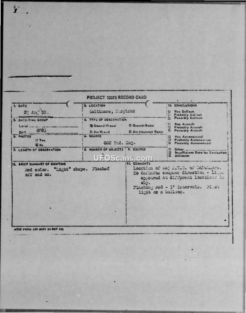 A civilian Ground Observer Corps volunteer reported multiple sightings of a flashing red light over Baltimore in August 1952. The Air Force investigated the reports, including radar checks, but concluded there was insufficient data to identify the object.