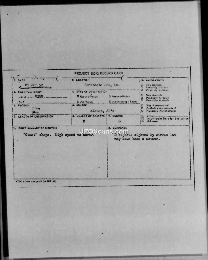 The report documents two separate sightings of aerial phenomena at Barksdale AFB. The first object was described as comet-shaped and moving at high speed. The second sighting involved an object that exhibited color changes and hovering behavior before disappearing.