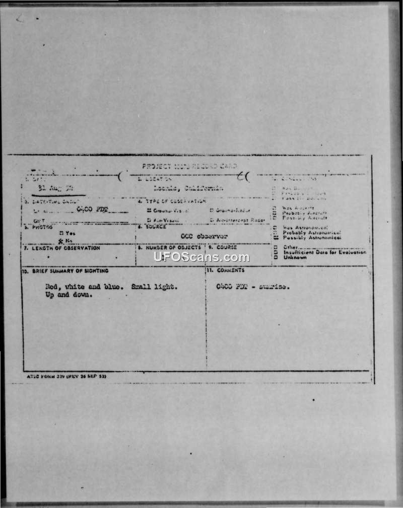 The object was observed by Ground Observer Corps personnel between 0400 and 0500 PDT on 31 August 1952. It was described as a small light, colored red, white, and blue, which moved up and down and made no sound.