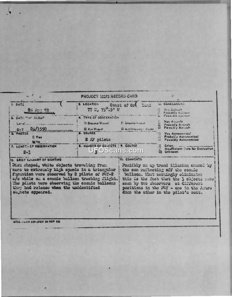 On 29 August 1952, at approximately 1550Z, two pilots from Patrol Squadron Twenty Three, LTJG W.A. O'Flaherty and LTJG R.S. Moore, were conducting a cosmic balloon tracking flight over the coast of Greenland at an altitude of 10,000 feet. While flying a P4Y-2 aircraft, they observed a cosmic balloon at 74,000 feet. Upon the release of the balloon's instrument parachute, the pilots observed three additional white, spherical or disk-like objects. These objects were estimated to be between slightly smaller than the balloon and half its size. The objects maintained a triangular formation relative to the balloon for approximately two to three minutes. The observers noted that the objects possessed no visible aerodynamic features, trails, exhaust, or propulsion systems. After remaining stationary relative to the balloon, the objects accelerated rapidly to speeds estimated to be in excess of the speed of sound before disappearing. The pilots, both Naval Academy graduates, were considered highly reliable. They discussed the objects over the aircraft's internal communication system while observing them. A third crew member, LT Callahan, was in the co-pilot's seat but did not observe the objects due to the aircraft's flight path and the relative positioning of the balloon. The weather conditions were reported as clear with unlimited visibility above an 8,500-foot undercast. The crew contacted an icebreaker in the area to determine if other objects were intended to be released, but were informed that only one had been deployed. The official record card for Project 10073 suggests the sighting might have been an optical illusion caused by the sun reflecting off the balloon, though the narrative reports from the pilots emphasize that the fact the objects were seen by two observers from different positions in the aircraft seemingly eliminates this possibility.