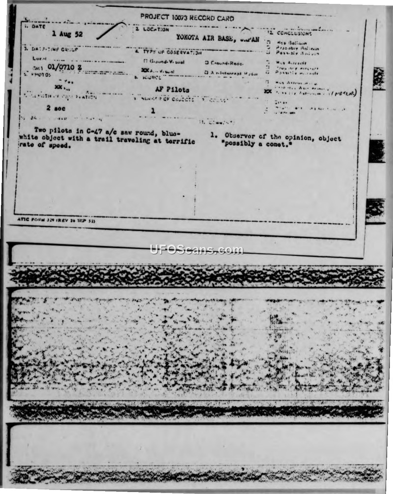 Two USAF pilots in a C-47 aircraft reported a blue-white object with a trail near Yokota Air Base on 1 August 1952. The object was observed for two seconds and officially suggested to be a possible comet.