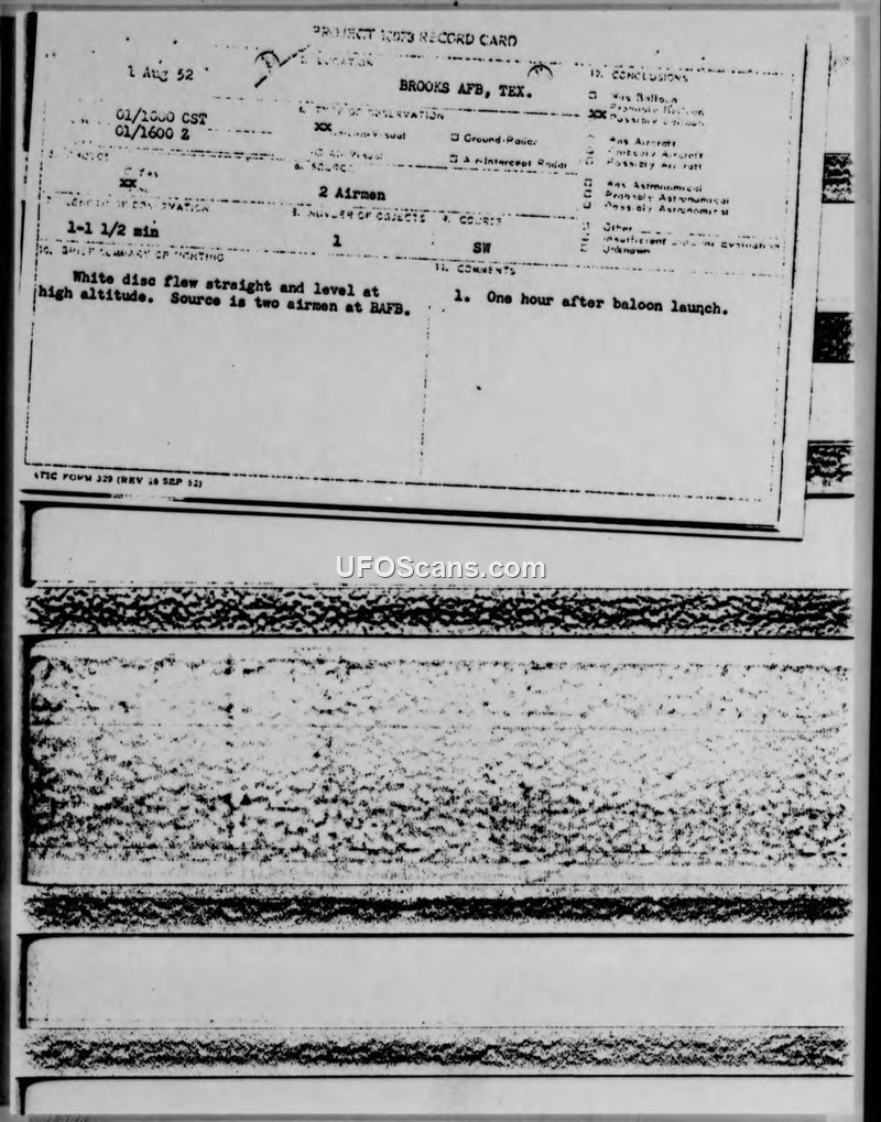 Two airmen at Brooks AFB reported a white, disc-shaped object moving at high speed and altitude on 1 August 1952. The official report concluded there was no known meteorological or other explanation for the sighting.