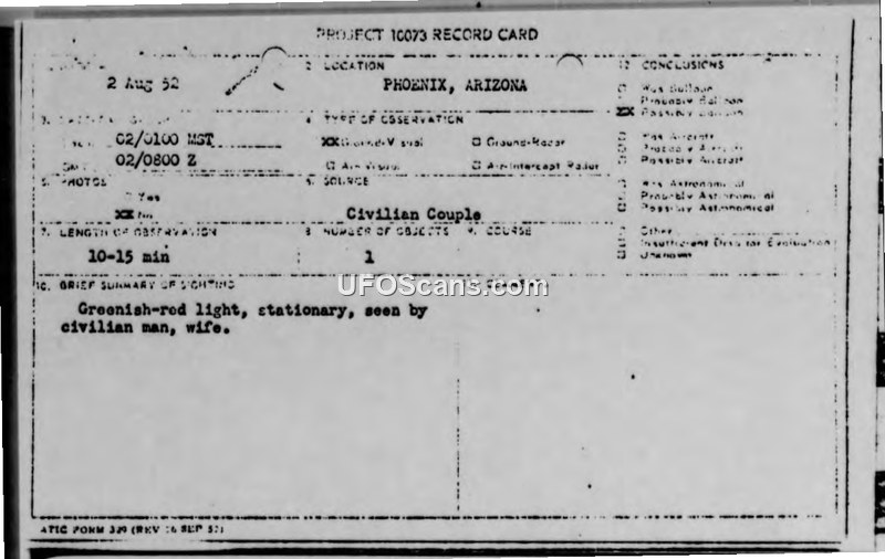 Project 10073 Record Card — Phoenix, Arizona, 2 August 1952