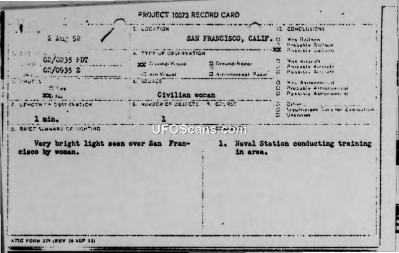 Project 10073 Record Card — San Francisco, Calif. 2 Aug 52