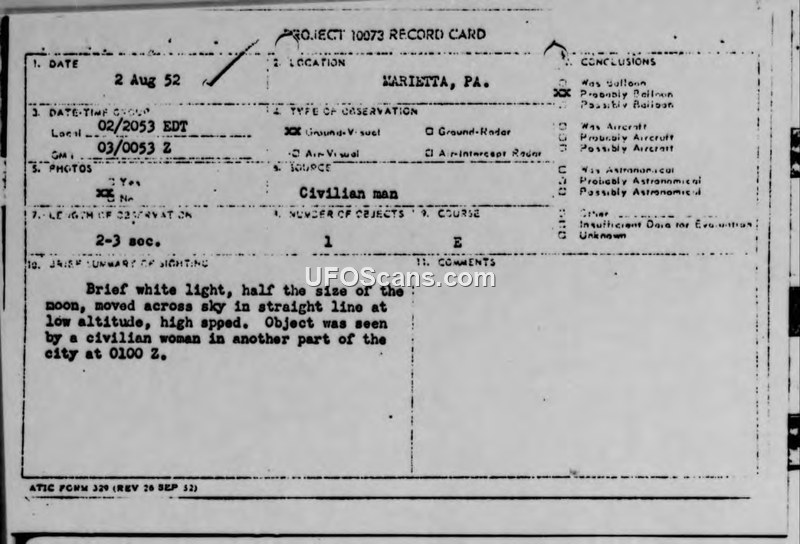 A civilian pilot and former radio operator reported a brilliant, silent, high-speed white light over Marietta, PA, on August 2, 1952. The Air Force intelligence report concluded the sighting could not be explained by aircraft or astronomical phenomena.