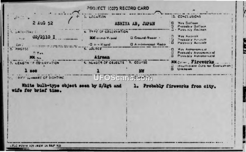 A 1952 Air Intelligence report from Ashiya Air Base, Japan, documents a one-second sighting of a white, bulb-like object. The military investigation concluded the object was likely fireworks from the nearby town.