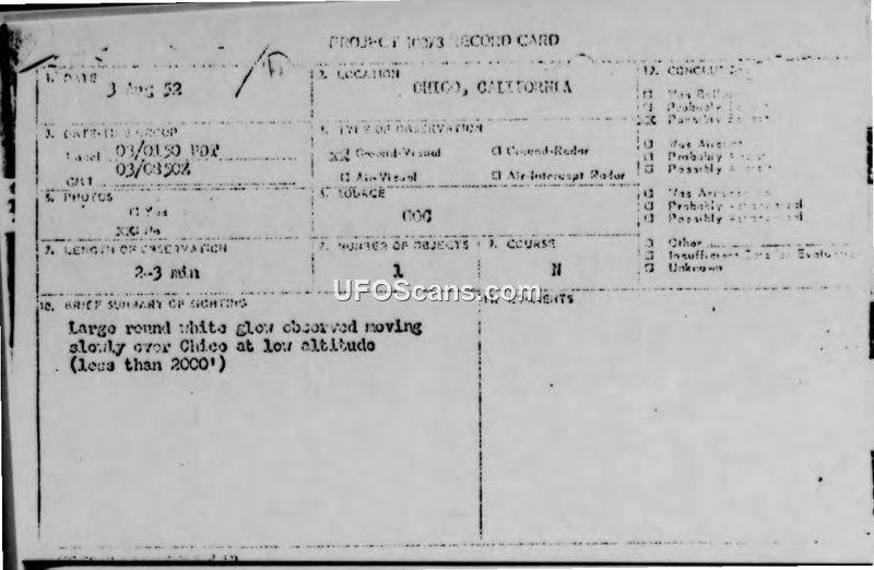 Project 10073 Record Card — Chico, California, 3 August 1952