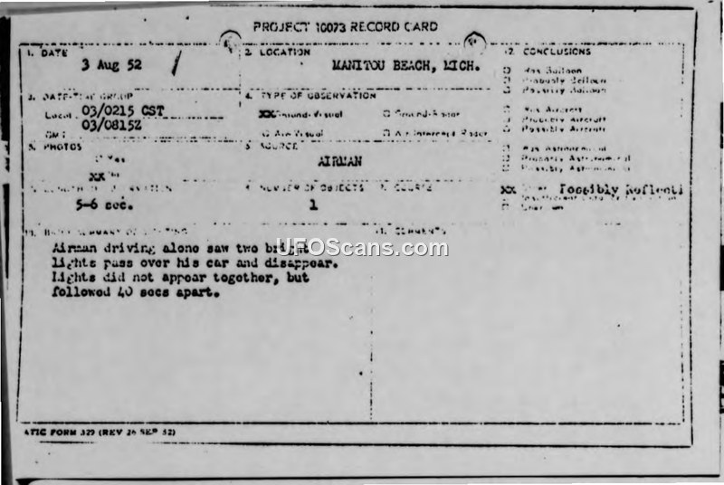 Project 10073 Record Card and Related Correspondence — Sighting of 3 August 1952, Michigan