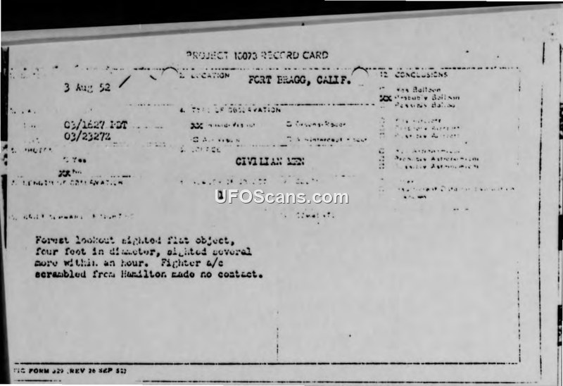 On August 3, 1952, at 1627 PDT, a forest lookout near Fort Bragg, California, reported observing an unidentified aerial object. The witness described the object as flat and approximately four feet in diameter. Within an hour of the initial sighting, the witness reported seeing several more of these objects in the area. Fighter aircraft were scrambled from Hamilton Air Force Base to investigate the report, but they were unable to make contact with any objects. A subsequent phone call received at 1655 PDT by a duty controller from a forest lookout official suggested that the objects were believed to be weather balloons. The weather conditions at the time of the sighting were reported as clear, and no sounds were heard from the objects. The estimated altitude of the objects was 5500 feet.
