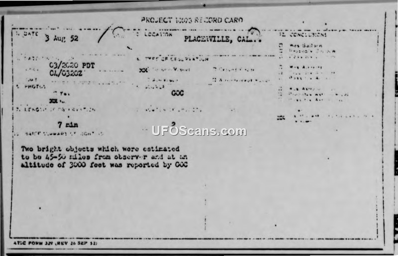 Project 10073 Record Card — Placerville, California, 3 August 1952