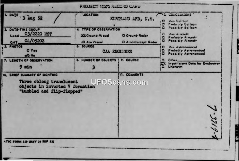 On August 3, 1952, at approximately 22:20 local time, a CAA engineer stationed at Kirtland Air Force Base, New Mexico, observed three unidentified objects. The objects were described as oblong and translucent, flying in an inverted V formation. During the nine-minute observation, the objects were noted to have tumbled and flip-flopped in their flight path. The observer reported that the objects had no visible exhaust or propulsion systems and made no sound. One of the objects was specifically described as plate-shaped. The weather conditions at the time included scattered clouds at 22,000 feet, 30 miles of visibility, and light winds from the north-northwest, with a near-full moon. The report was transmitted by the 34th Air Division to the Director of Intelligence at USAF Headquarters and the Air Technical Intelligence Center. The official conclusion recorded on the project card is that there was insufficient data for evaluation.