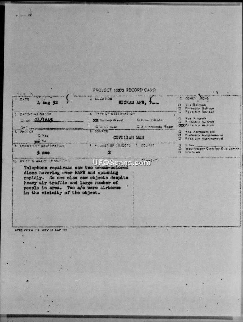 This collection of documents comprises various sighting reports, record cards, and intelligence information reports filed under Project 10073 during August 1952. The reports detail multiple sightings of unidentified aerial phenomena across the United States and Hawaii. One notable incident involves a telephone repairman at Hickam AFB in Hawaii, who reported seeing two cream-colored, disc-shaped objects hovering and spinning rapidly at an altitude of approximately 2,000 feet. The objects were estimated to be 6 to 8 inches in diameter and moved at a speed of 400 miles per hour before disappearing. Another report involves a Lt. Col. who observed a bright, green, welding-torch-like object in the sky near Chanute AFB, Illinois, which moved in a perpendicular line before making an abrupt right-angle turn. Other reports include sightings of luminous, round objects in Middletown, Pennsylvania, and Falls Church, Virginia. The documents reflect the Air Force's systematic attempt to collect and standardize data on these occurrences, often using observer questionnaires. Many of the reports conclude that the data is insufficient for a definitive evaluation, and some investigators note that the lack of detailed information renders certain reports of dubious value. The documents also highlight the involvement of various military units, including the 145th Fighter-Interceptor Squadron and the 48th Air Transport Squadron, in reporting and investigating these events.