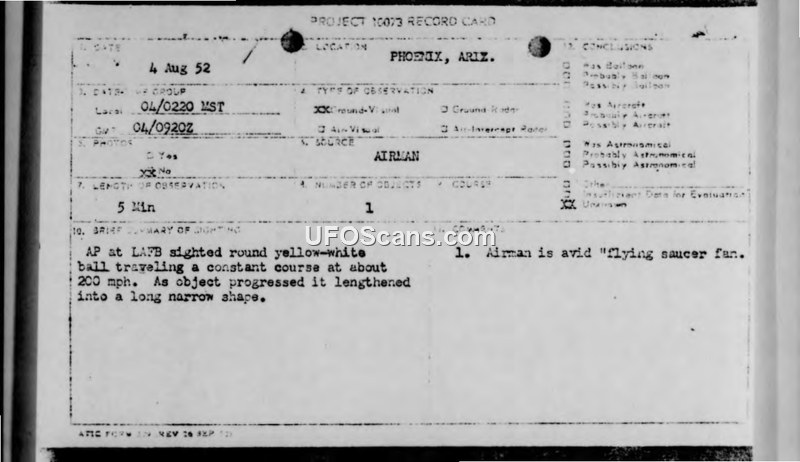 Project 10073 Record Card and Associated Reports — Phoenix, Arizona, 4 August 1952