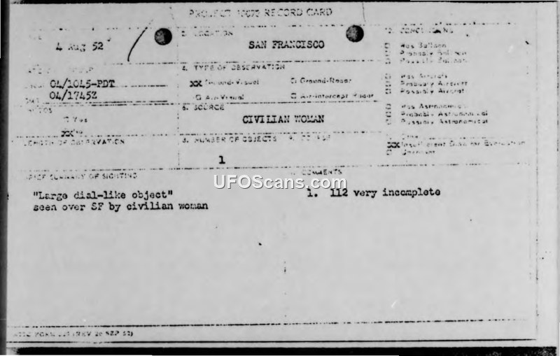 A civilian woman reported a 'large dial-like object' over San Francisco on August 4, 1952. Military intelligence investigated the report but concluded there was insufficient data to identify the object.