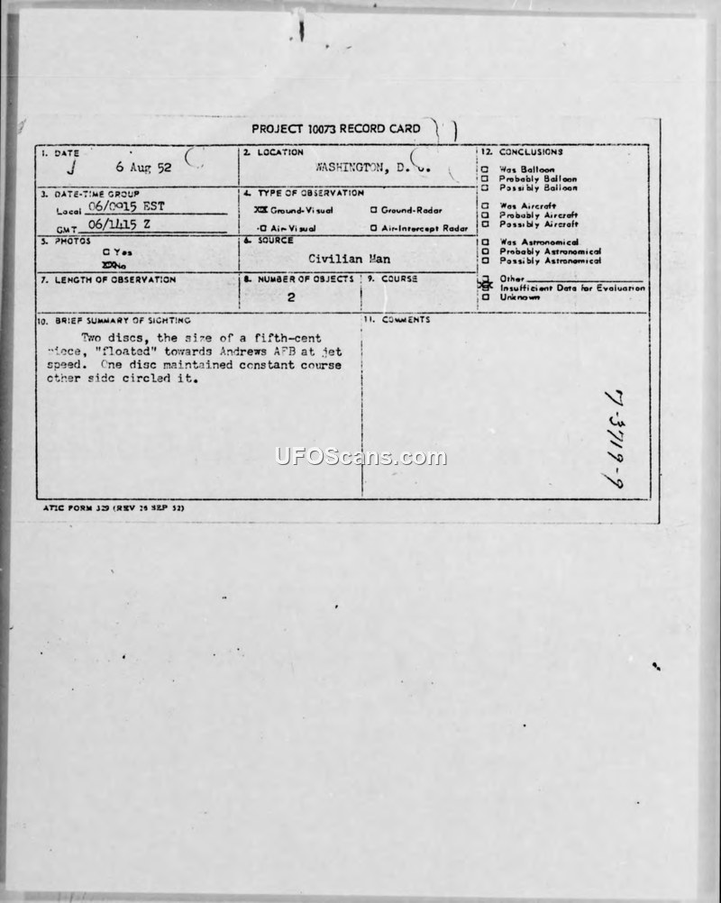 Project 10073 Record Card and Observer Questionnaire — Washington, D.C., August 24, 1952