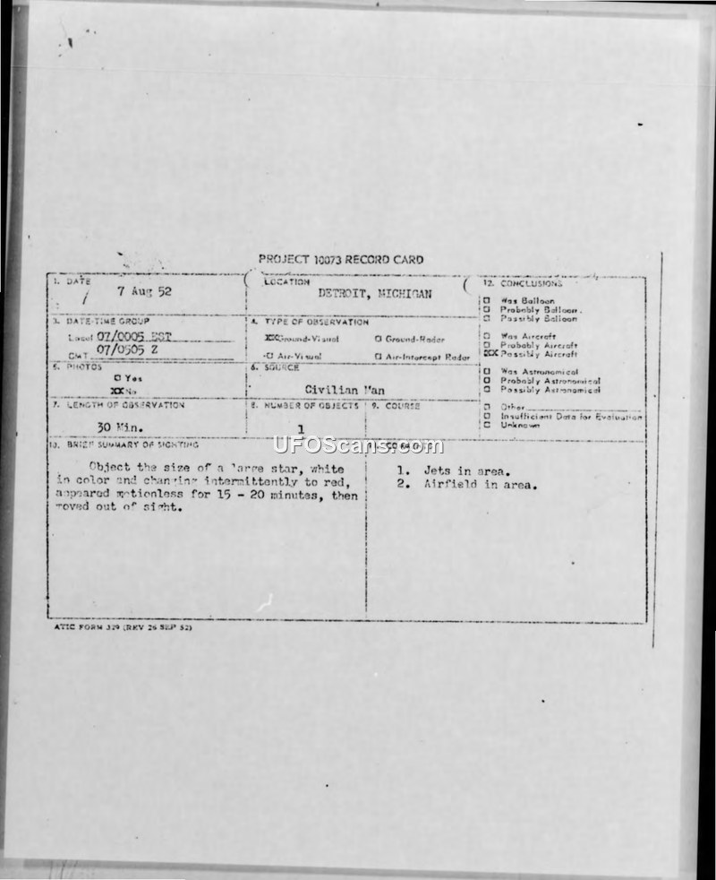 Project 10073 Record Card — Detroit, Michigan, 7 August 1952