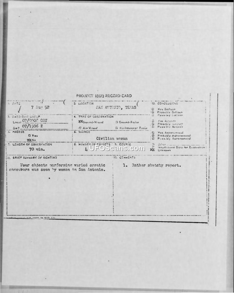 Project 10073 Record Card — San Antonio, Texas, 7 August 1952