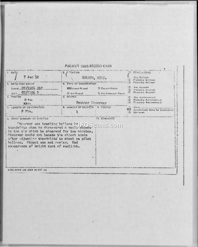 Project 10073 Record Card - Duluth, Minnesota - 7 August 1952
