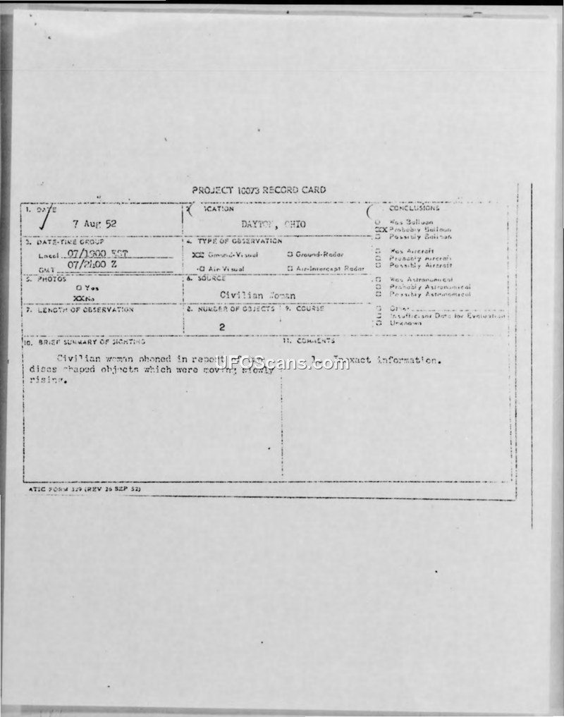 This document is a collection of Project 10073 record cards and memoranda for record, documenting various reports of Unidentified Aerial Phenomena (UAP) in the Dayton and Piqua, Ohio areas during August 1952. The reports include accounts from civilians and military personnel. One notable incident involves a civilian who reported seeing two disc-shaped objects with a 'weird glow' moving across the sky on the night of August 24, 1952. The witness, who was initially skeptical of 'flying saucer' reports, described the objects as being about 15 times the size of a star, moving from the southwest to the southeast before disappearing. Another report involves an airman from the 97th Fighter-Interceptor Squadron who observed an object due east of his home between 2400 and 0100 hours, which he described as three to four times larger than a star. A third report, received via the Piqua Police Department, described an oblong object with flashing red and blue lights. The official evaluations for these sightings, recorded on Project 10073 cards, consistently categorize the events as having 'insufficient data' or being astronomical in nature, such as planets or stars. The documents include completed observer questionnaires where witnesses provided details on their location, the duration of the sighting, and the physical characteristics of the objects. The investigating officers, including Captains Marlyn Knauff and C.O. Spencer, noted the difficulty in obtaining precise information from witnesses, often citing the 'inexact' nature of the reports. The file serves as a record of the Air Technical Intelligence Center's efforts to process and categorize civilian and military reports of aerial phenomena during the height of the 1952 wave of sightings.